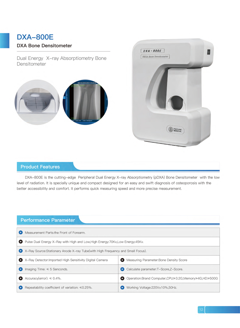 The DXA-800E dual energy X-ray absorptiometer measures bone mineral density with high accuracy and good repeatability, and is a good assistant for doctors in clinical diagnosis.