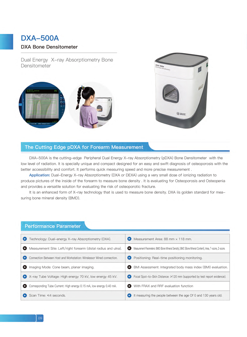 DXA-500A is the cutting-edge Peripheral Dual Energy X-ray Absorptiometry (pDXA) Bone Densitometer with the low level of radiation. it is specially unique and compact designed for an easy and swift diagnosis of osteoporosis with the better accessibility and comfort. it performs quick measuring speed and more precise measurement .