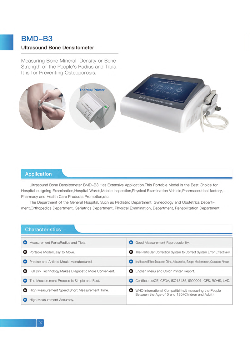 Ultrasound Bone Densitometer BMD-B3 has Extensive Application.This Portable Model is the Best Choice for Hospital outgoing Examination,Hospital Wards,Mobile Iinspection,Physical Examination Vehicle,Pharmaceutical factory,Pharmacy and Health Care Products Promotion,etc.